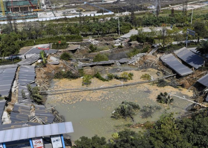 Um trecho da rua e da calçada afundou, deixando um ponto de ônibus próxima à beira da cratera, de acordo com fotos e vídeos da mídia estatal. O local era parte da construção da segunda linha de metrô de Foshan.