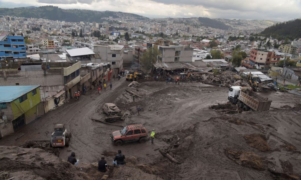 “Vimos imenso rio negro que arrastava tudo, tivemos que escalar muros para escapar”, disse a moradora Alba Cotacachi, que retirou as duas filhas da casa. “Estamos procurando os desaparecidos.”
