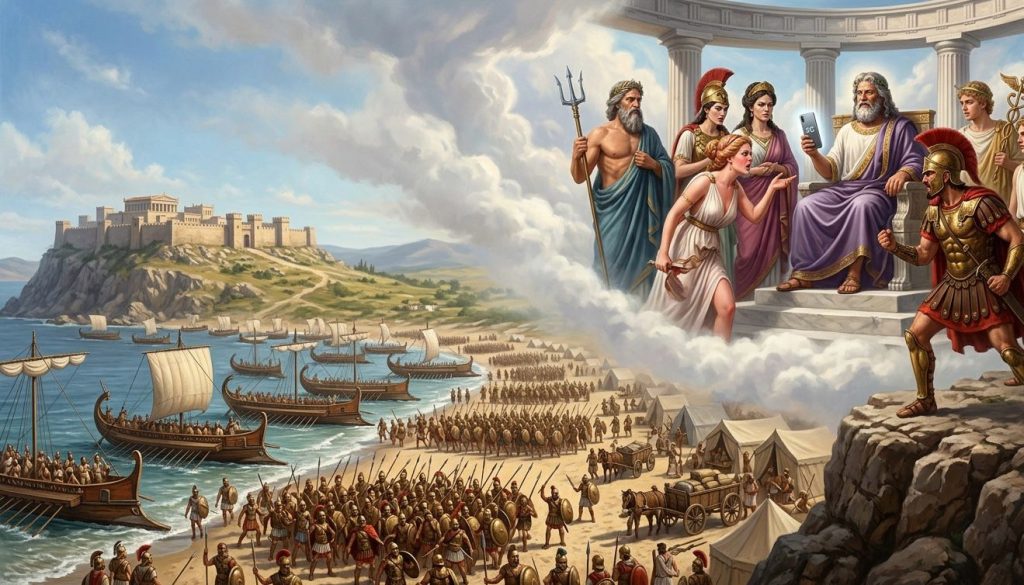 Início da guerra de Troia. Os barcos aqueus atracavam no litoral da Ásia, enquanto, lá de cima, os deuses do Olimpo se preparavam para assistir de camarote à carnificina que logo iria começar.