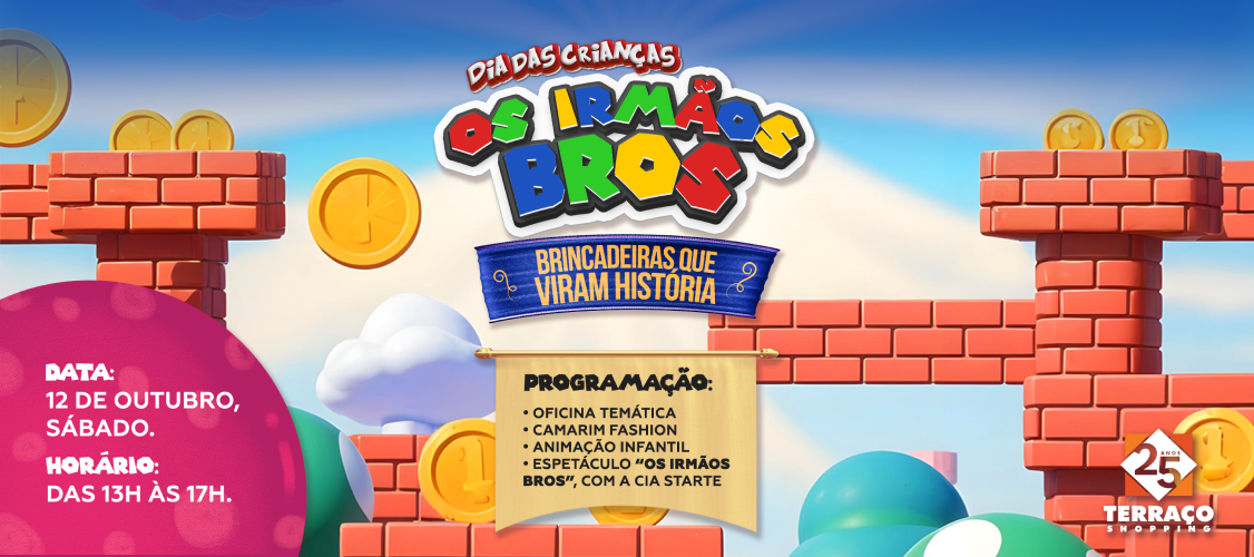 O Dia das Crianças é uma data muito aguardada pelas famílias e para tornar essa comemoração ainda mais especial, o Terraço Shopping preparou uma programação imperdível para o sábado, dia 12 de outubro. A partir das 13h, crianças e adultos poderão desfrutar de um evento temático inspirado em um dos jogos de videogame mais queridos de todos os tempos, os Irmãos Bros.