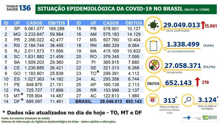 Já a soma de pessoas infectadas desde o início da pandemia chegou a 29.049.013. Em 24 horas foram confirmados 15.961 diagnósticos positivos para a covid-19.