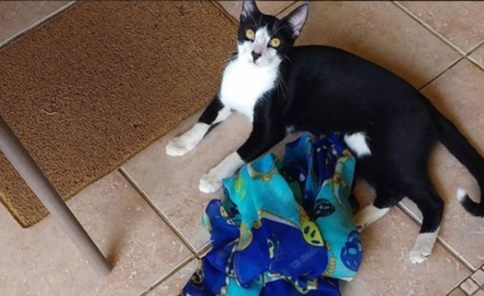 “Me perdoem, vizinhos, mas eu realmente sofro da doença do roubo, sou cleptomaníaco, mas estou super disposto a devolver tudinho. Por favor, ajudem a minha mãe a achar os donos das peças que estão expostas no meu perfil”, diz a legenda de uma foto com regatas e uma cueca que o felino Back furtou.