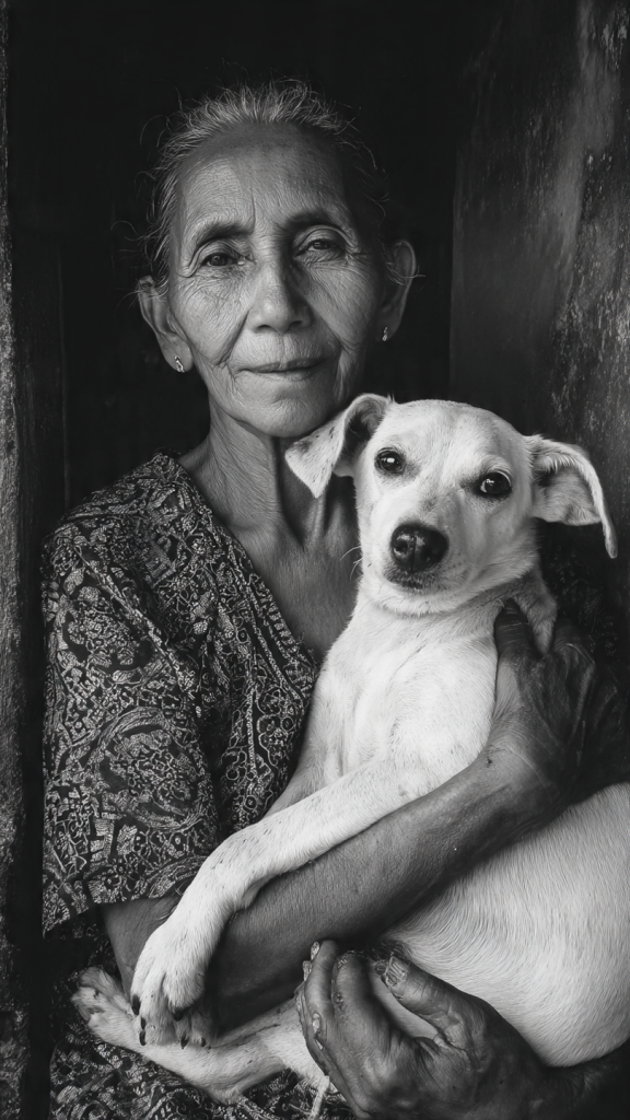 Ela acolheu o vira-lata no colo e o levou até a cozinha, onde lhe deu um pouco da comida que lhe faltava.