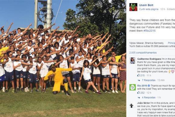 “Eles dizem que estas crianças são de comunidades mais perigosas aqui do Rio. Elas são nosso futuro e estou muito feliz de ter me reunido com eles # Rio 2016”, escreveu Bolt no Facebook.