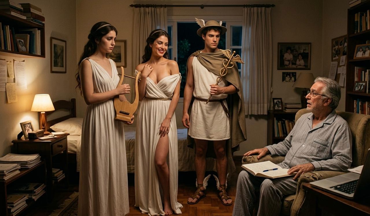 O ambiente estava ficando pesado, com as duas musas olhando com desdém uma para a outra e ambas cobrando, com os olhos, uma decisão do contista, quando se materializou no aposento uma terceira personagem. Era homem e tinha asas nos pés.