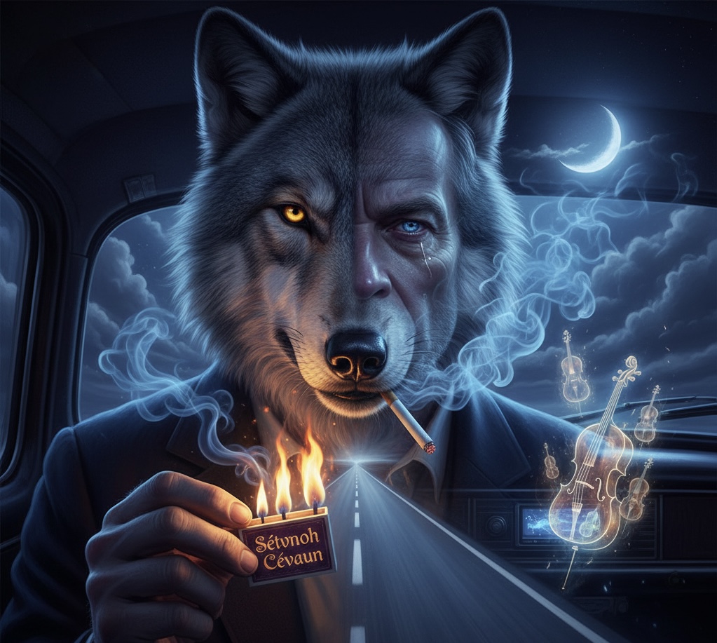 Metamorfoseando-se na estrada escura, dentro do automóvel transido no embalo do violoncelo cromático, lentamente ele transforma-se num lobo, num puro lobo de cinzento pelo, espesso e cru cinzento pelo. Tem brilhos e uivos o seu olhar.