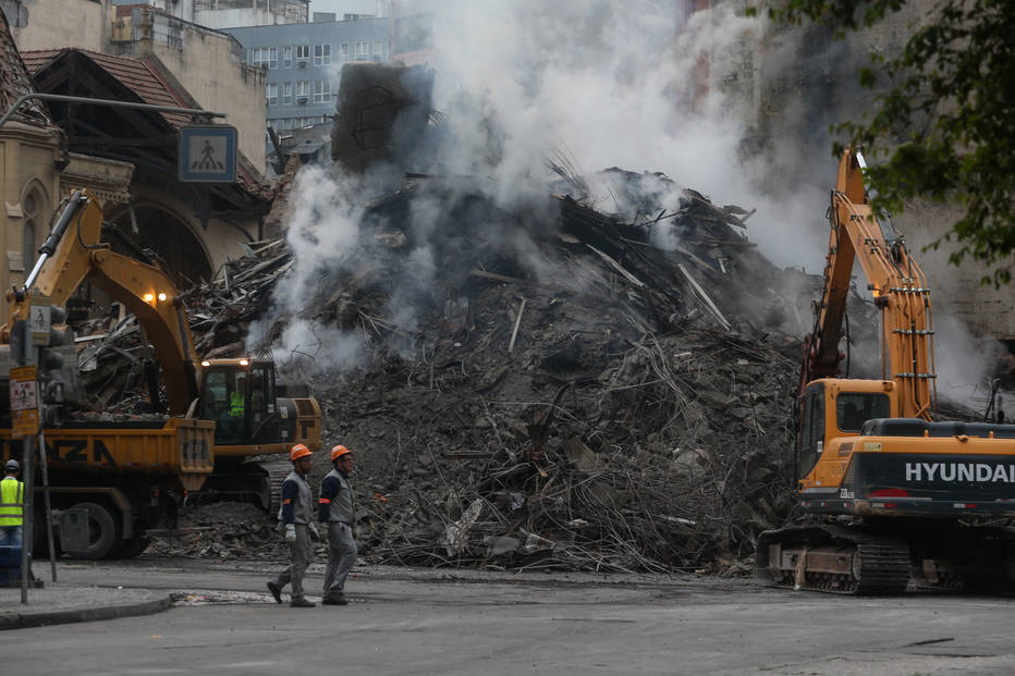 Duas retroescavadeiras retiram material pesado, como ferro retorcido, desde as primeiras horas da manhã. Durante o trabalho das máquinas, que abrem acessos para cães farejadores buscarem vítimas, homens de capacete laranja em solo observam objetos entre os escombros. Caso seja localizado algum objeto diferente no meio do material, o bombeiro solicita a interrupção do trabalho das máquinas.