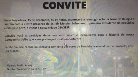 O presidente da Ceagesp, coronel da reserva da PM de São Paulo Ricardo Mello Araújo, enviou um convite a permissionários, políticos e autoridades paulistas convidando todos...