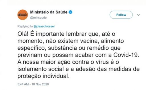 O Ministério da Saúde, respondendo a questionamento de um tuiteiro, postou em sua conta no Twitter nesta quarta-feira (18) que não existem remédios ou outras substâncias...