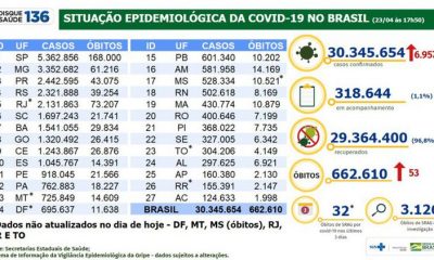 O número de mortes por covid-19 no Brasil subiu para 662.610. Em 24 horas, foram registradas 53 mortes. Já o total de pessoas infectadas pelo novo...