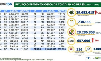 O Brasil registrou, desde o início da pandemia, 657.696 mortes por covid-19, segundo o boletim epidemiológico divulgado nesta terça (22) pelo Ministério da Saúde. O número...