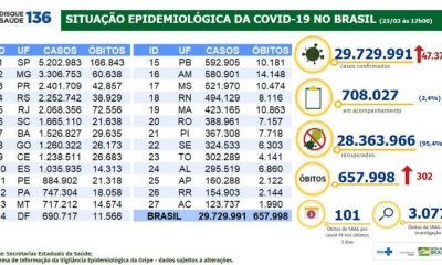 O Brasil registrou, desde o início da pandemia, 657.998 mortes de covid-19, segundo o boletim epidemiológico divulgado nesta quarta (23) pelo Ministério da Saúde. O número...