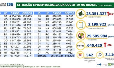 Desde o início da pandemia, 28.245.551 pessoas foram infectadas pelo coronavírus. Nas últimas 24 horas, foram confirmados 37.339 diagnósticos positivos da doença. A quantidade de casos...