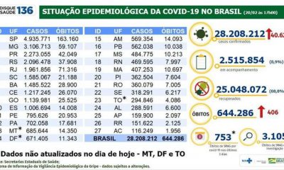 O Brasil alcançou neste domingo (20) a marca de 644.286 mortes causadas em decorrência de complicações associadas à covid-19. Em 24 horas foram 406 novos registros....
