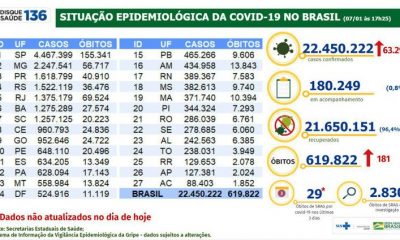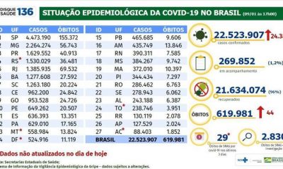 O Brasil registrou 49.303 novos diagnósticos positivos de covid-19 em 24 horas, segundo boletim divulgadono final da tarde deste sábado (8) pelo Ministério da Saúde. O...