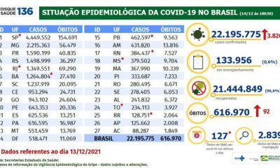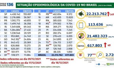 Mais 1.419 pessoas foram infectadas pelo novo coronavírus, em 24 horas. Desde o início da pandemia, o total de infectados chegou a 22,213 milhões. Desse total,...