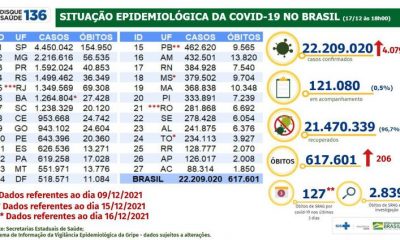 O total de pessoas infectadas pelo novo coronavírus desde o início da pandemia chegou a 22.209.020. Em 24 horas, autoridades de saúde registraram 4.079 casos positivos...