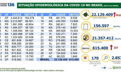 O Ministério da Saúde divulgou nesta sexta (3) novos números sobre a pandemia de covid-19 no país. De acordo com levantamento diário feito pela pasta, o...