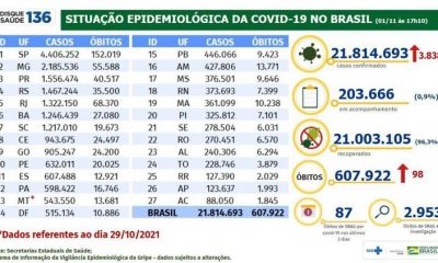 O balanço divulgado nesta segunda-feira (1º) pelo Ministério da Saúde registra 3.838 novos diagnósticos de covid-19 em 24 horas. O dado eleva para 21.814.693 o número...