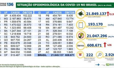 O balanço divulgado nesta terça-feira (2) pelo Ministério da Saúde registra 6.431 novos diagnósticos de covid-19 em 24 horas. Esse dado eleva para 21.821.124 o número...