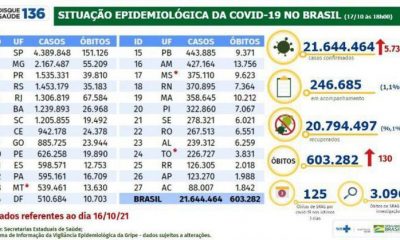 O balanço divulgado neste sábado (16) pelo Ministério da Saúde registra 11.250 novos diagnósticos de covid-19, em 24 horas. Com isso, sobe para 21.638.726 o número...