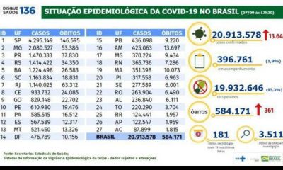 A soma de pessoas infectadas pelo novo coronavírus desde início da pandemia alcançou 20.899.933. Em 24 horas, as secretarias de saúde confirmaram 9.154 pessoas infectadas com...