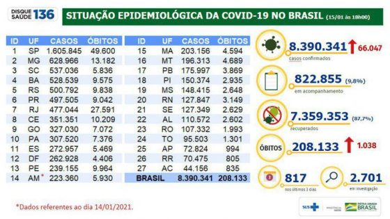 As vidas perdidas por conta da pandemia do novo coronavírus totalizam 208.133. Nas últimas 24 horas, as autoridades de saúde registraram 1.038 mortes pela covid-19. Foi...