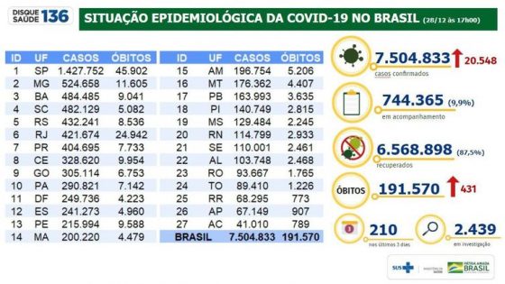 O Brasil ultrapassou a marca de 7,5 milhões de casos de covid-19. Com 20.548 novos diagnósticos positivos da doença registrados nas últimas 24 horas, o país...