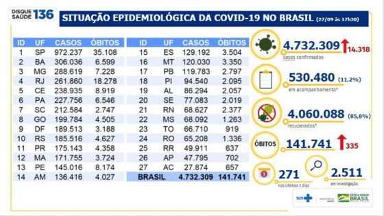 O boletim diário do Ministério da Saúde, divulgado nesta terça-feira (29), revela que o Brasil registrou 4.777.522 casos confirmados do novo coronavírus desde o início da...