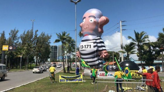 O “pixuleco”, boneco inflável representando o ex-presidente Luiz Inácio Lula da Silva em um uniforme de presidiário, foi inflado na porta do apartamento do petista em...