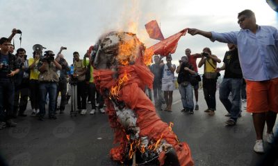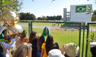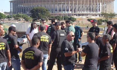 Perto de 100 manifestantes, de acordo com a Polícia Militar (PM) do Distrito Federal, atearam fogo a uma réplica da Taça da Fifa, a cerca de...