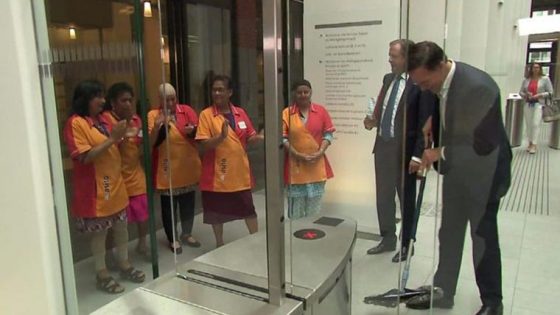 Ao invés de deixar para uma funcionária da equipe de limpeza, o primeiro-ministro da Holanda limpou o café com leite que ele próprio derrubou no chão...