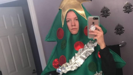 Kelsey Hall, uma estudante de química na universidade do Alabama, nos Estados Unidos, fez post no Twitter no último sábado, 2, usando uma fantasia de árvore...