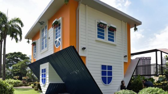 Uma casa de dois andares construída de cabeça para baixo se transformou em atração turística em Kuala Lumpur, na Malásia. Os objetos internos, como cadeiras, mesas,...