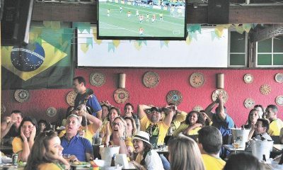 Os torcedores brasileiros e estrangeiros esquentam as vendas em bares e em lojas de enfeites e de televisores durante a Copa do Mundo, que chega na...