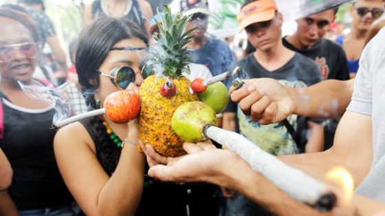 Durante marcha da maconha no dia 7 de maio, colombianos fumaram a droga com “cachimbos” improvisados. Participantes usaram maçã, abacaxi e até melancia para fumar a...