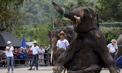 Uma escola de treinamento de elefantes em Xishuangbanna, na província de Yunnan, na China, atrai dezenas de turistas com um show. Durante as aulas, os elefantes...