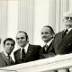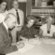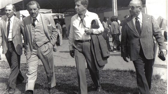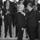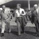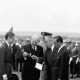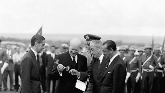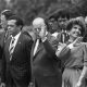 José Escarlate Coube ao presidente Dwight Eisenhower lançar a pedra fundamental da Embaixada dos Estados Unidos da América em Brasília. Ele desembarcou do Air Force One...