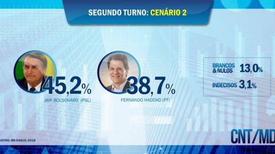 O candidato Jair Bolsonaro (PSL) segue na liderança isolada das intenções de voto para a Presidência, seguido por Fernando Haddad (PT), conforme os resultados da pesquisa...