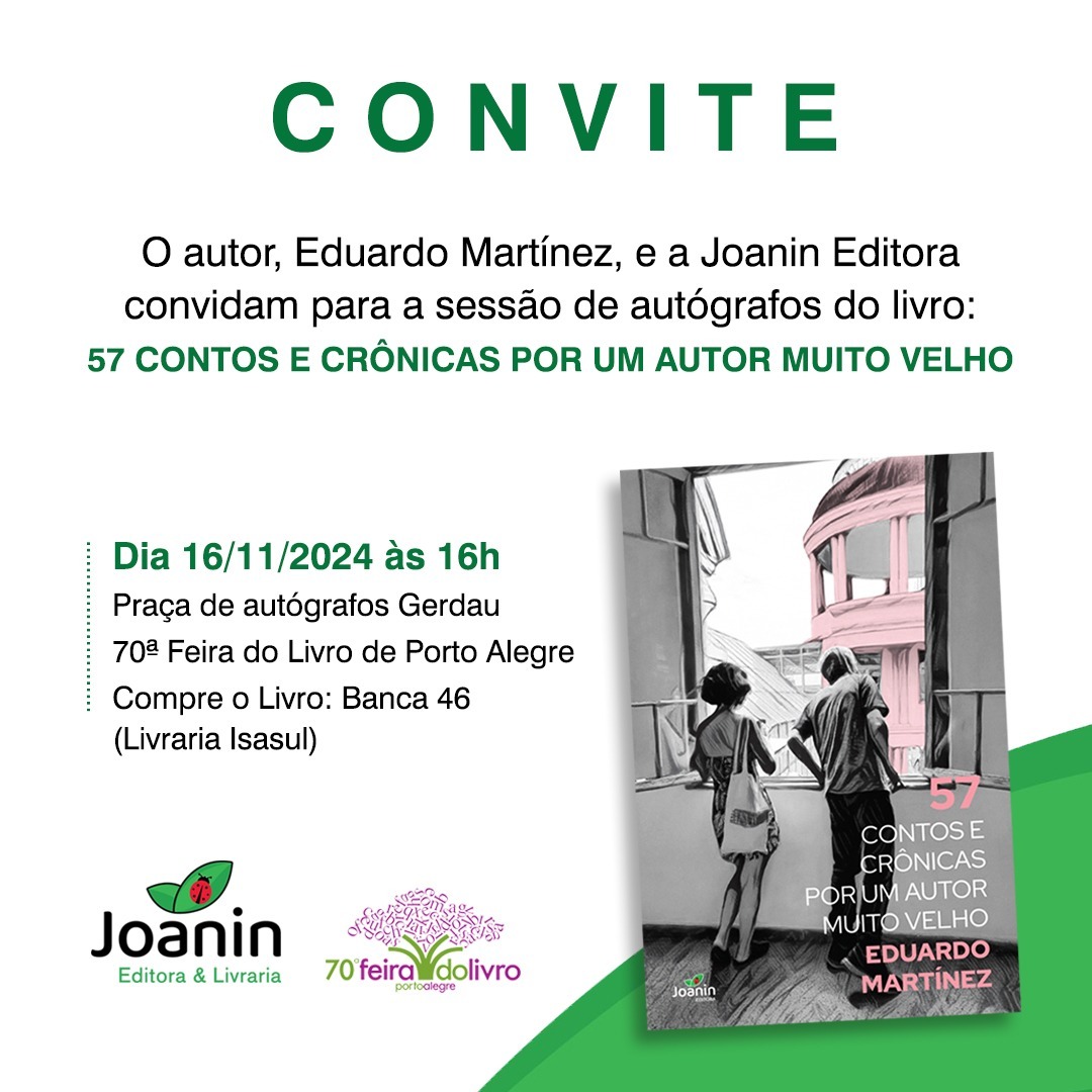O escritor Eduardo Martínez, nosso coleguinha aqui em Notibras, estará na Feira do Livro, em Porto Alegre, às 16h deste sábado, 16, autografando seu livro “57 Contos e crônicas por um autor muito velho”.
