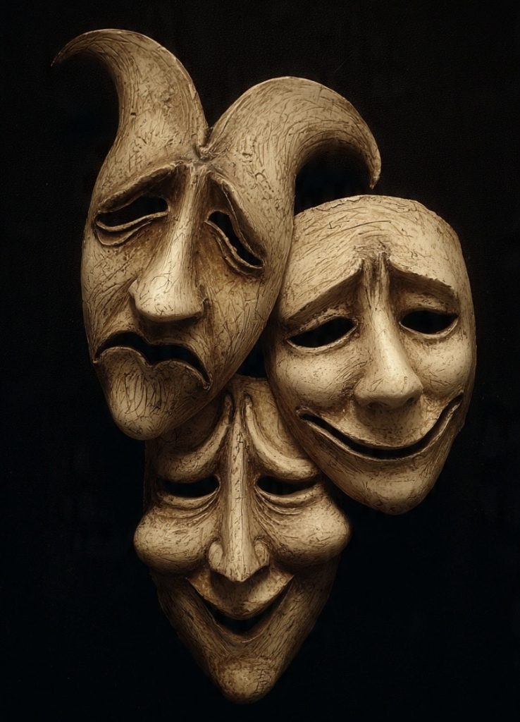 (Por uma ironia dos deuses do espaço-tempo, essas duas máscaras influenciaram – poderiam ter influenciado – poderiam ter sido influenciadas por – máscaras de Pierrô e Arlequim, da Commedia dell’Arte.)