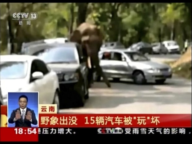 Após uma desilusão amorosa – perdeu uma fêmea para outro macho-, um elefante selvagem descarregou toda sua raiva contra vários veículos que estavam estacionados em uma reserva em Xishuangbanna, na província de Yunnan, na China.
