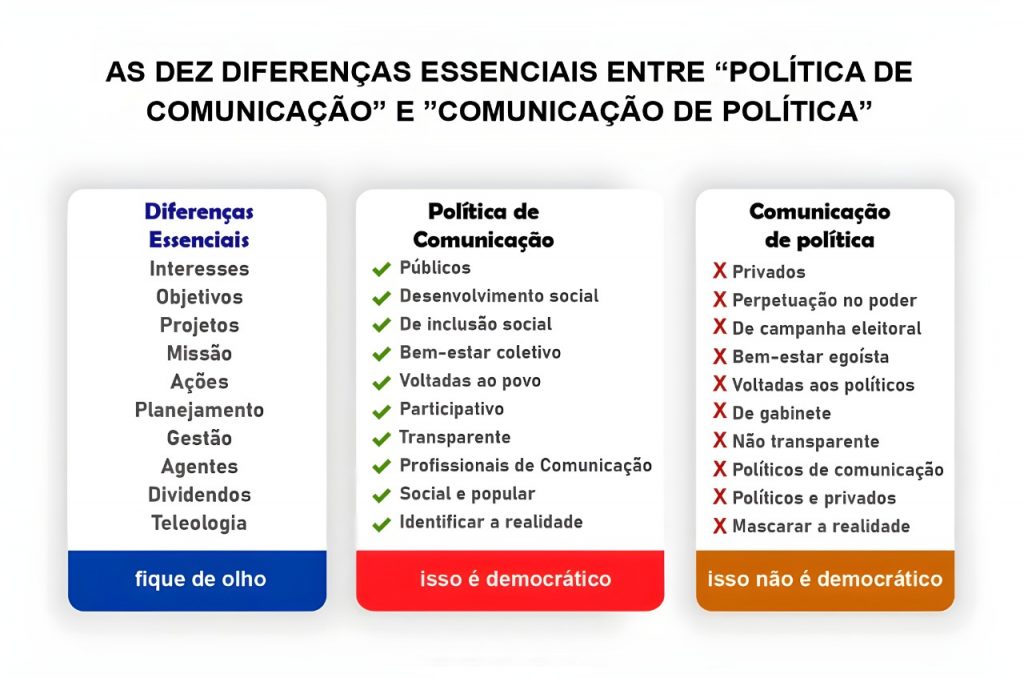 Daí também a necessidade urgente de o eleitor aprender as diferenças entre “política de comunicação” e “comunicação de política”. Política de comunicação é todo o planejamento de comunicação que tem objetivos claros, transparentes, e expõe o modo como esses objetivos serão alcançados. Comunicação de política é a mesma coisa, exceto pelo que os objetivos são omitidos, não são transparentes e o modo como esses objetivos serão alcançados depende em última instância do acesso a grandes verbas públicas.