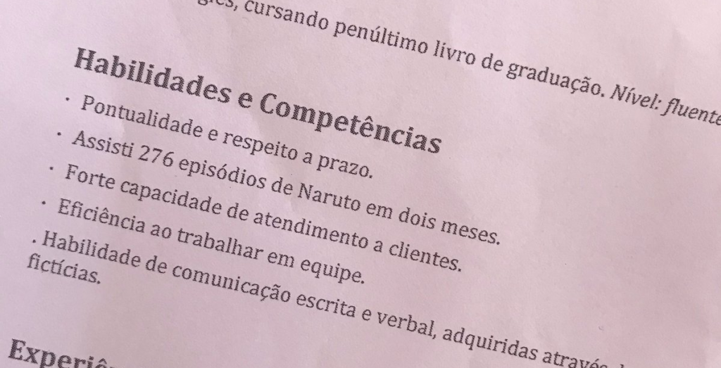 Um usuário do Twitter viralizou na internet após publicar uma foto do currículo que estava entregando procurando emprego em algumas empresas. Entre informações como suas habilidades com idiomas ou trabalho em equipe, aparecia a informação: “Assisti 276 episódios de Naruto em dois meses.”