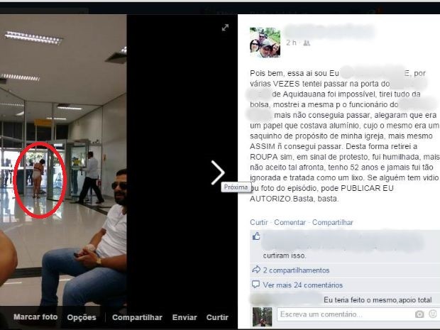 A empresária Zenilda Duarte, de 52 anos, ficou nervosa após ser barrada na porta de detector de metais de uma agência bancária em Aquidauana. Como não conseguiu entrar no local, ela tirou as roupas e ficou seminua.