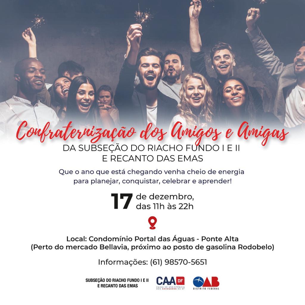 Uma das mais esperadas festas de confraternização de advogados neste fim de ano acontece nesta sexta, 17. Será no Condomínio Portal das Águas – Ponte Alta (Próximo ao Mercado Bella Via, coladinho no posto de gasolina Rodobello). Advogadas e advogados vão estar reunidos para comemorar as muita vitórias pessoais e da advocacia que tivemos neste ano de 2021.