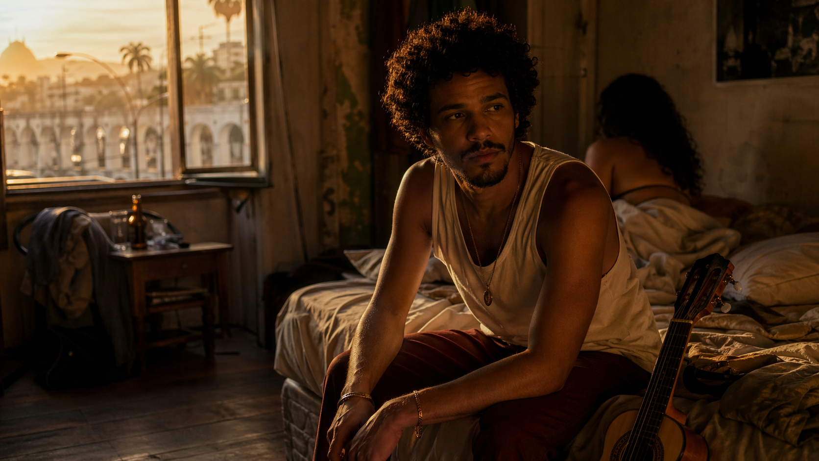 Ao final de cada roda de samba, a grana é curta e o cansaço é grande. Certa vez, só por diversão, investi meus olhares e meu sorriso mais encantador em uma morena de olhos tristes. Ela estava com algumas amigas, não parecia muito animada. Eu também não estava buscando romance, tampouco amor verdadeiro. Minha meta é bem simples: uma cama para me recostar com uma mulher desejável, sem precisar encarar a dura realidade de voltar para casa. Naquela noite, a morena de olhos tristes foi a minha musa.