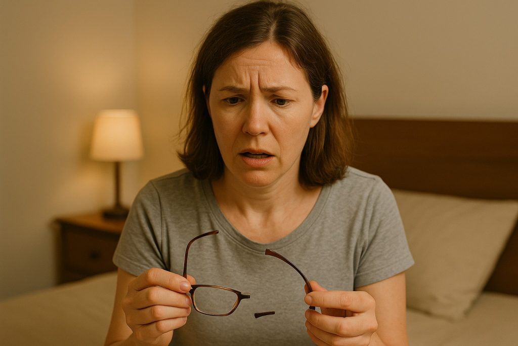 — Uma catástrofe! Quebrei meus óculos, olha, as duas hastes… Estou perdida.