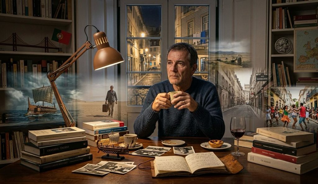 Pensei em seguida em meus próprios exílios. A troca de uma carreira bem-sucedida de editor na Abril Cultural pelo canto de sereia – não por acaso, imagem da Odisseia – do mundo acadêmico; a inadaptação, a sensação de ser, em Paris, um estranho numa terra estranha; a guinada rumo a Portugal, deixando para trás um casamento já em crise; o delicioso exílio lisboeta, entre passeatas, fados, bandeiras vermelhas e guitarradas; o exílio dentro do exílio, em Évora, como professor universitário; a hostilidade crescente contra o professor brasileiro, à medida que a revolução caminhava para um desfecho, que me levou a desistir da empreitada alentejana e me fez sentir na carne a xenofobia que recai sobre a grande maioria dos exilados; alguns meses de vagabundagem em Lisboa e em Paris, como ex-professor e ex-doutorando sem perspectivas.