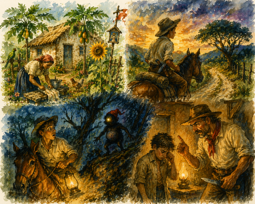 — “Sozinho?” Ué! Até quando? É preciso acostumar. Onze anos, é homem… Eu com dez varava sertão.